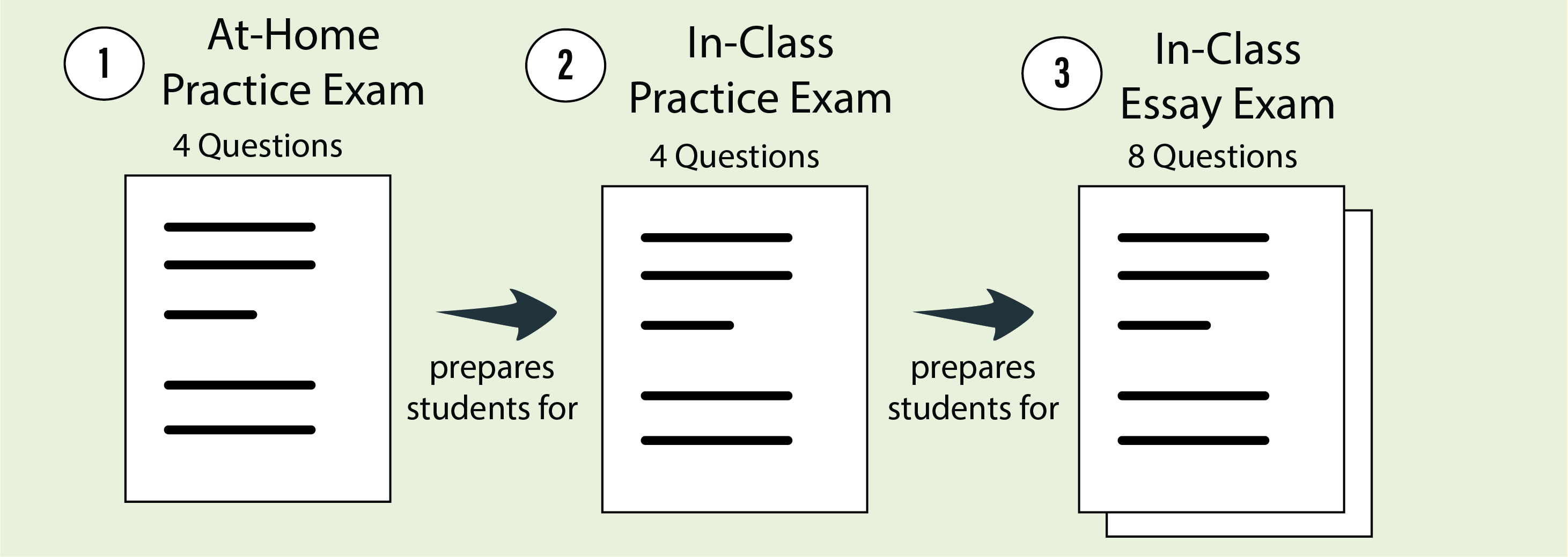 These assessments are focused exclusively on higher Bloom’s level open-ended questions that require paragraph-length responses. There are three Essay Exams over the course of the semester, and for each one, students engage in each assessment three times successively: