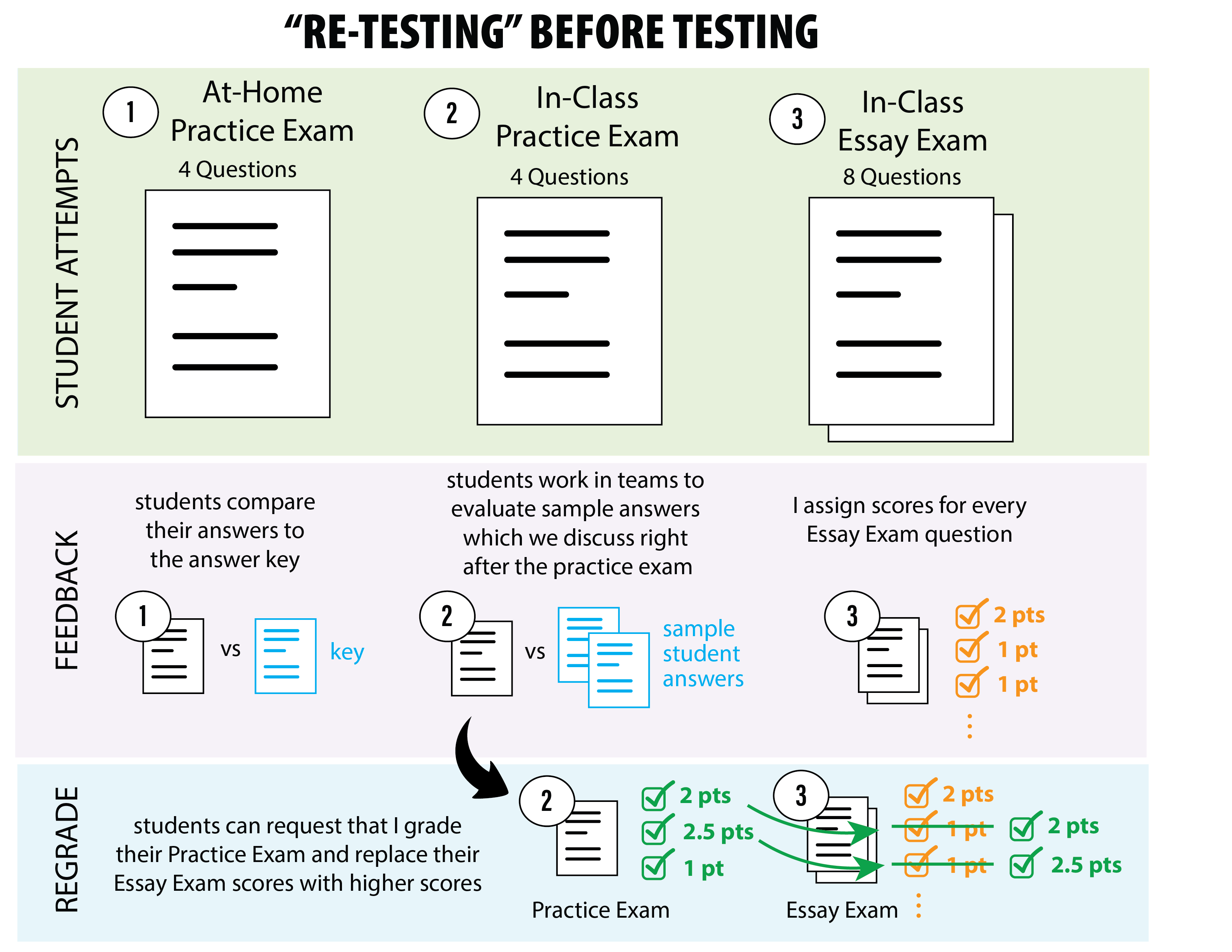I like that what I actually grade (their effort on the Essay Exam) reflects the learning they’ve done after two practice exams, and so it should, theoretically, represent their most advanced level of learning. This is different than traditional re-testing, where the instructor grades a student’s first attempt, and the second (and third, etc).
