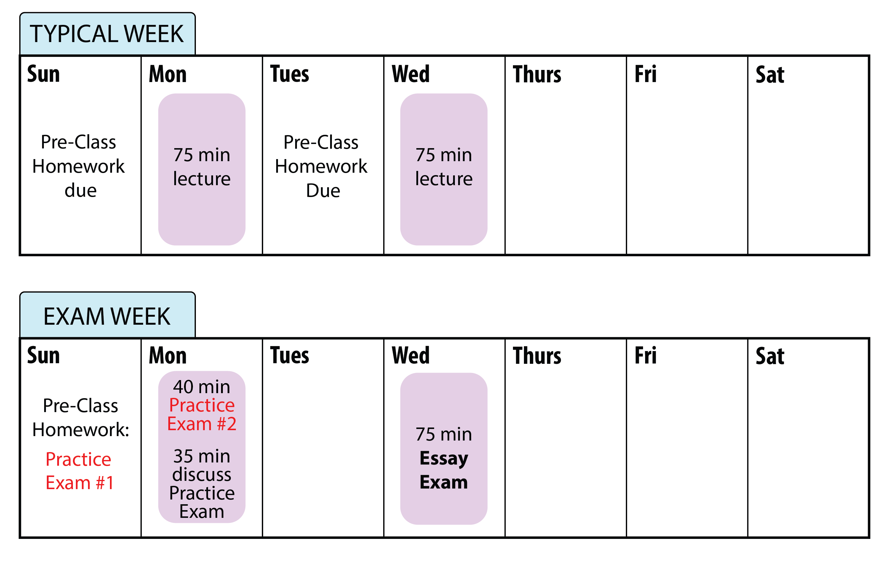 There are 3 Essay Exams in the 16-week semester. For each Essay Exam, I dedicate a full week of the course, largely to support the practice opportunities. Before students take the actual Essay Exam, I give them two opportunities to practice. One of those opportunities becomes the re-test opportunity later.